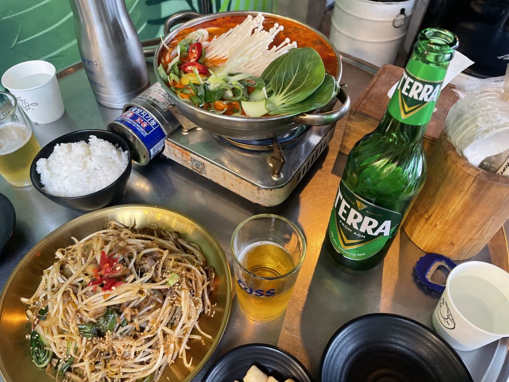 | Day3 09:30 瑞源(あわび粥) 11:00 明洞買い物 13:00 広蔵市場お昼ご飯/買い物 17:30 プチョンユッケ 20:30 鐘路3街ポジャンマチャ(飲み屋屋台)通り 23:00 明洞チキン通り 26:00 就寝 |
