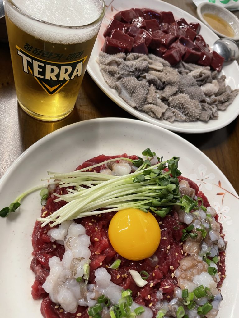 この日はとにかく食べて飲む日ってことで、まずは1日目に断念したプチョンユッケに再挑戦しました。